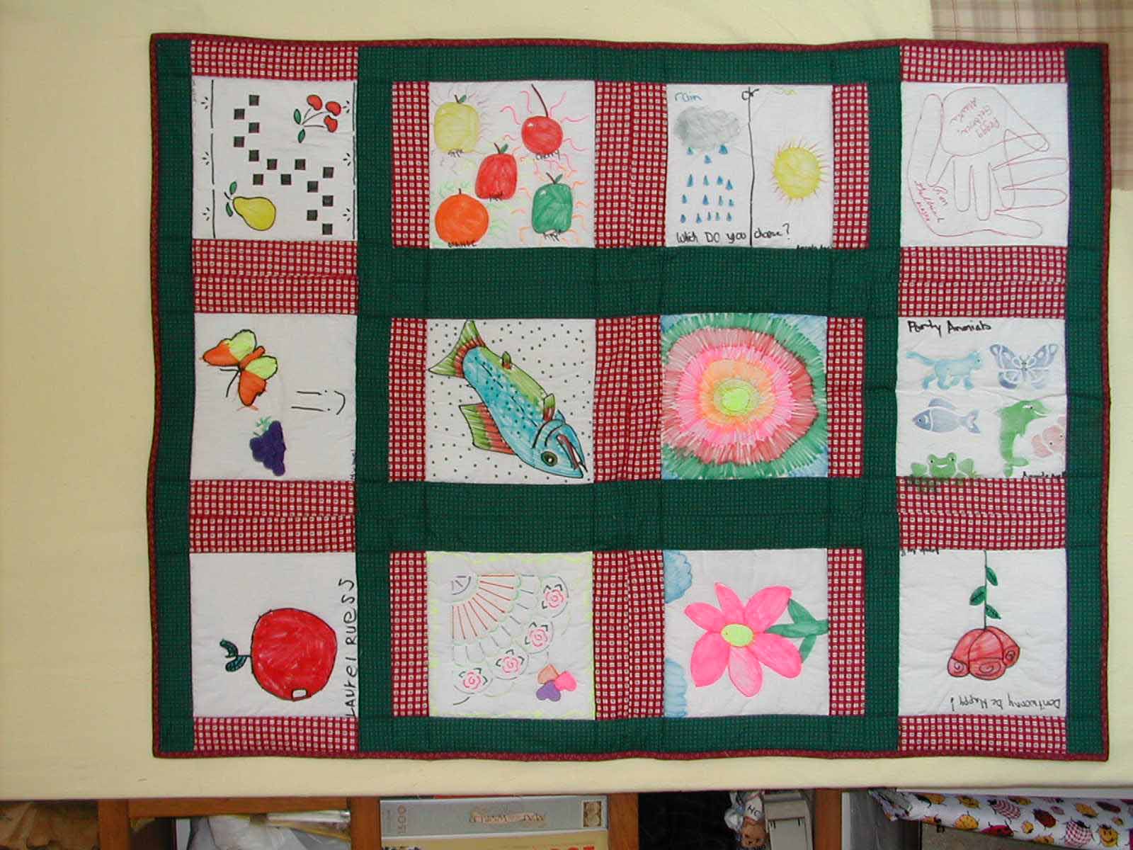 At our local quilt guild show, children draw on quilt blocks, then we